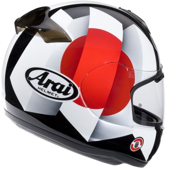 The Arai Axces II – Tribute here is being designed by Aldo Drudi for his dedication to Japan that was hit by tsunami recently. The three dimensionally designed folded sheet of the ‘Hinomaru’, the rising sun of Japan flag is very striking and doesn’t go unnoticed. The 3D is obtained the clever play of colours. The air intake and extractor are in smoke black colour to matched the overall design.