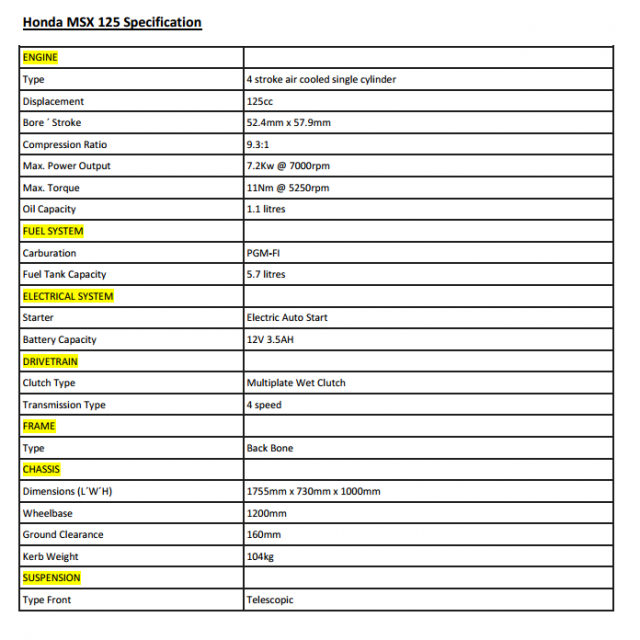 Spesifikasi teknikal 2017 Honda MSX 125 Specs