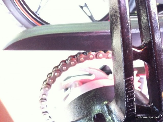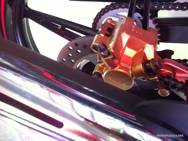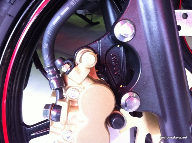 3. The rear brake caliper is engraved with the word ‘NISSIN‘. Nissin rear brake caliper is priced at RM1000 if you buy it original separately. The front are might also be Nissin, but engraving is only on the caliper bracket. The brake hose is written ‘NICHIRIN’. See pictures below.