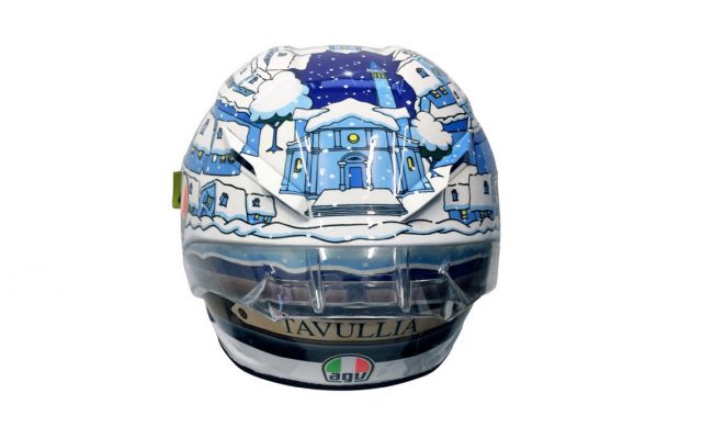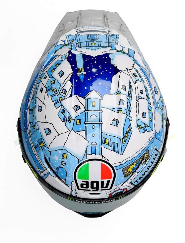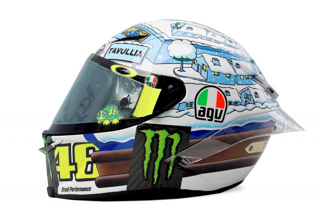Helmet yang telah direka khas bagi Valentino Rossi telah dibuat oleh artis terkemuka iaitu Alberto Drudi Dari Drudi Performance. Alberto merupakan salah satu kawan rapat Rossi yang telah lama bekerjasama bersama pelumba MotoGP tersebut. Bermula dari musim tahun lepas, Valentino Rossi telah mula menggunakan helmet terbaru dari AGV iaitu AGV Pista GP-R.
