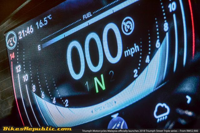 Street Triple RS ini mencecah hampir 200km/h pada jalan lurus belakang, itu pun sewaktu penulis sedang menunggang dengan berhati-hati memandangkan terdapatnya banyak motosikal yang lain di sekeliling. Namun itu masih lagi kelajuan yang pantas, terutamanya bagi mod ‘Rain’.