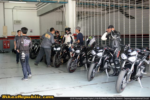 Kami kemudiannya menuju kea rah paddock, dan terlihat motosikal-motosikal Street Triple yang sedia terparkir di kedua-dua belah. Tiada yang lebih mengujakan daripada melihat jentera yang baru dan membayangkan diri sedang mengujinya buat kali pertama.