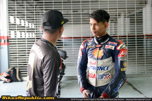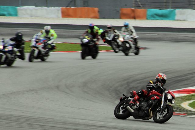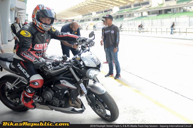 Seorang penunggang Asian talent Cup ( yang penulis lupa akan namanya kerana terlalu seronok) akan mengetuai kami untuk dua pusingan pertama, dengan ke semua motosikal ditala pad mod ‘Rain’. Kami kemudiannya telah memasuki semula pit dan kru teknikal Triumph akan menukar talaannya ke ‘Track’ bagi motosikal RS, ‘Sport’ bagi R, dan ‘Road’ untuk varian S.