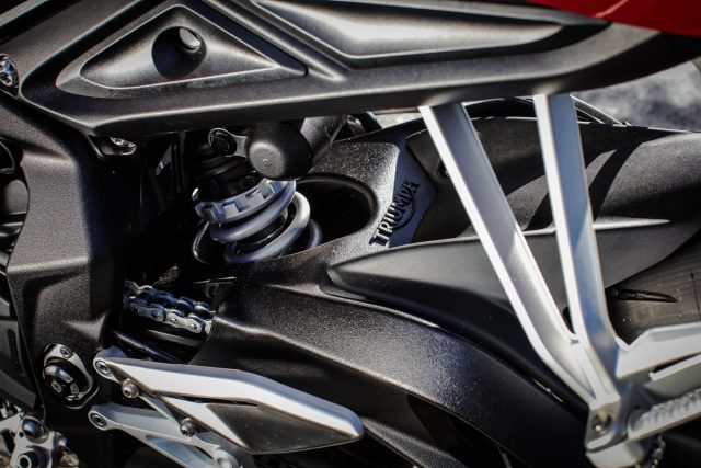 Suspensinya telah diaturcara bagi keselesaan penunggangan keseluruhan dan dengan itu ianya lembut sekali. Ianya tidaklah sampai mencecah bahagian bawah badan tetapi bahagian belakang perlu bekerja keras pada selekoh laju. Kami menunggang ke semua Street Triple dalam aturcara standard, dan saya pasti dengan memusingkan pramuatan sebanyak dua pusingan sudah mencukupi bagi mendapatkan ketinggian tunggangan yang lebih tinggi bagi tunggangan yang lebih lasak.
