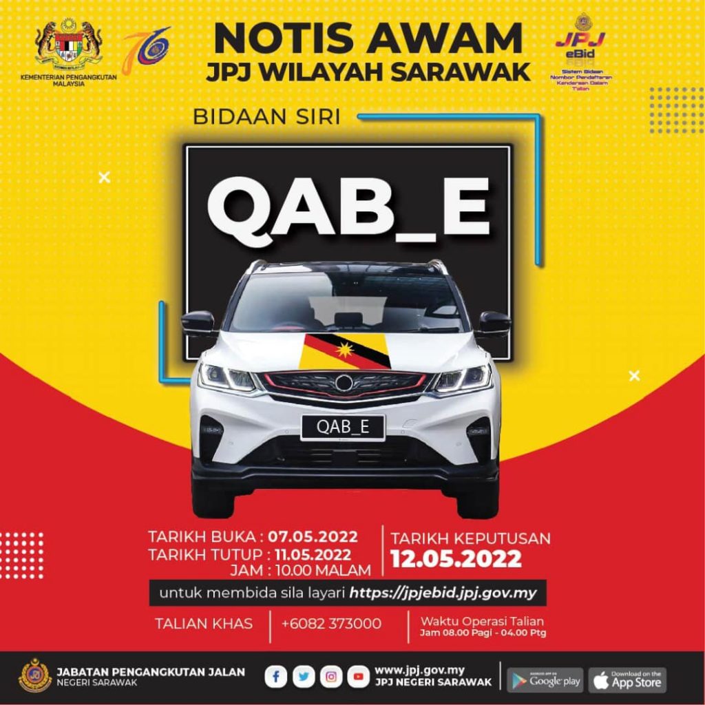 Sementara itu, orang ramai masih berpeluang untuk membida nombor siri QAB_E (Sarawak) yang sedang berjalan dan akan berakhir pada 11 Mei ini (esok) dengan keputusan akan diumumkan pada hari berikutnya.