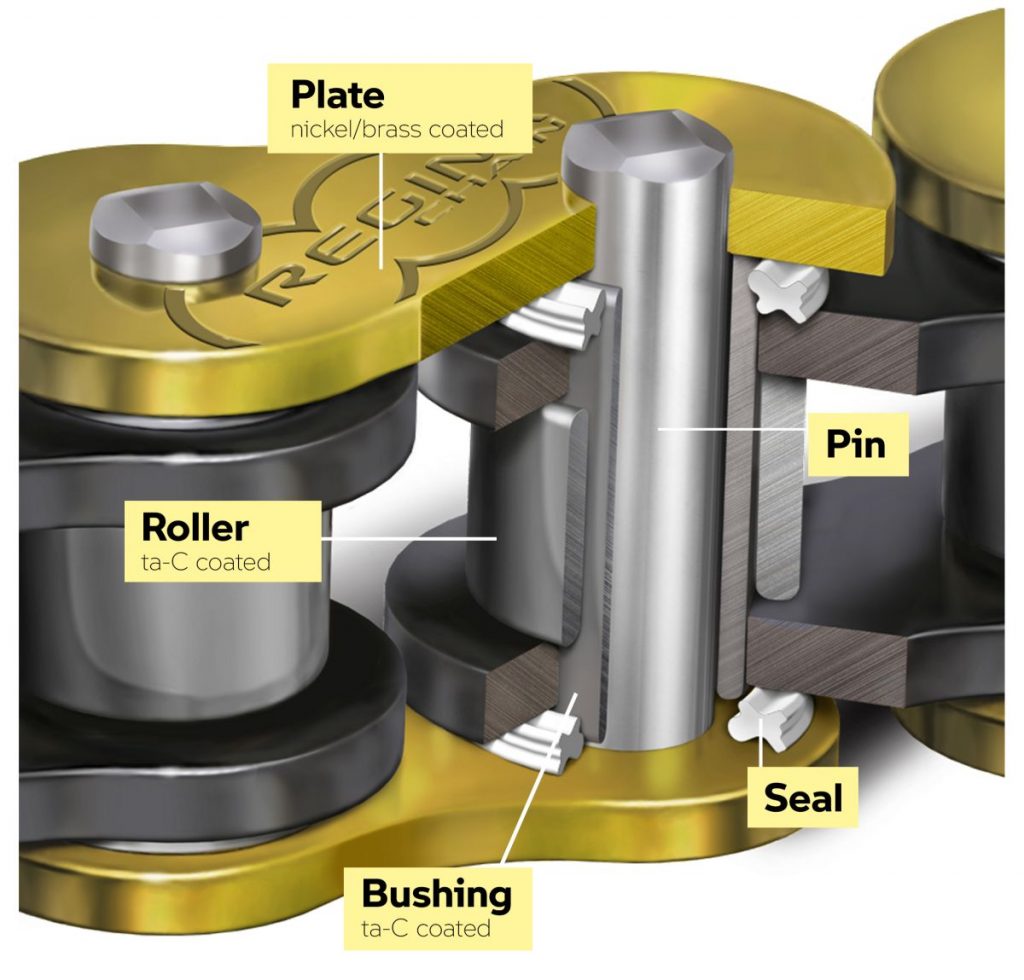 Salutan ta-C ini sangat kukuh dan tidak akan pudar atau merosot dari semasa ke semasa malah mengurangkan tahap geseran di bahagian dalam rantai.