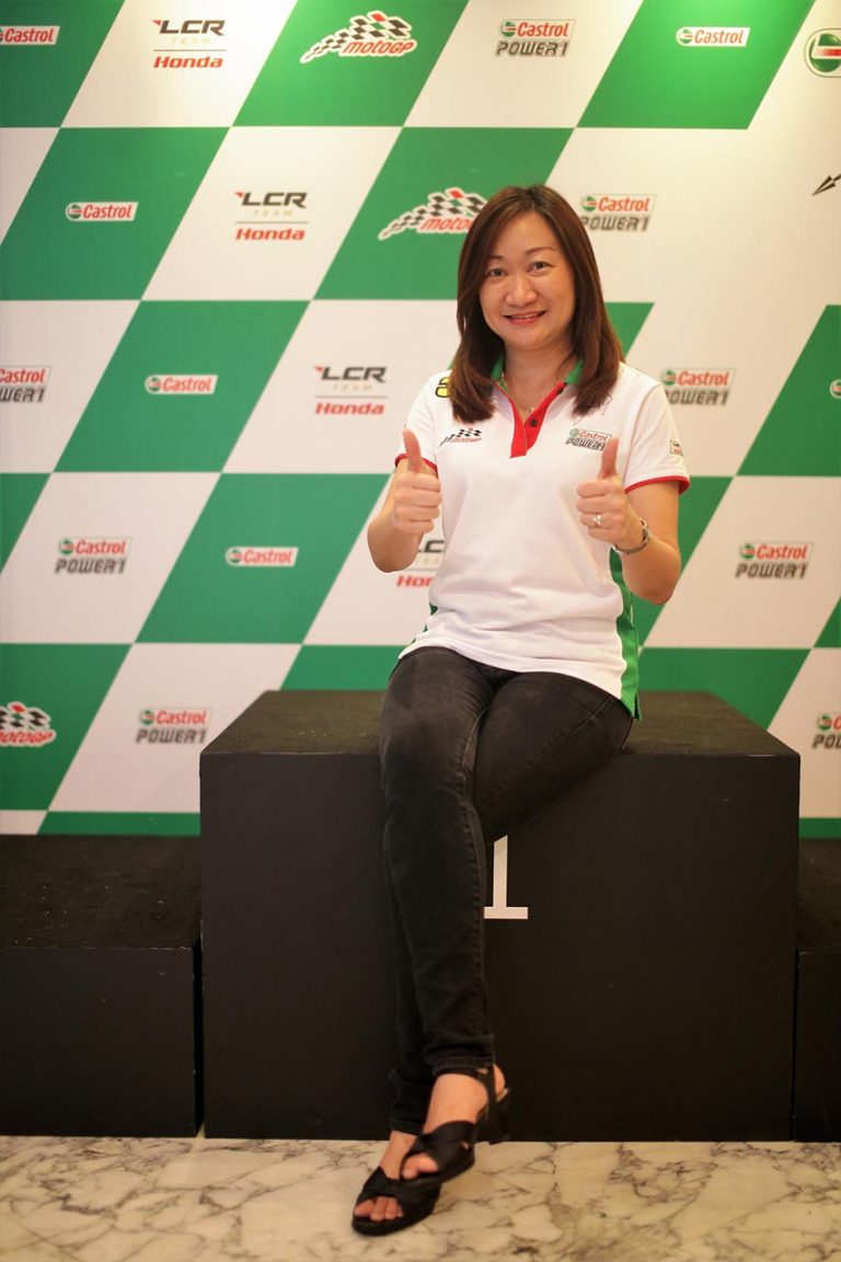 satu bahagian yang amat penting dalam pembangunan yang tidak pernah terhenti untuk produk berkualiti tinggi, buat penunggang perlumbaan dan bagi penggemar penunggangan motosikal di seluruh dunia. Dengan Castrol POWER1 sebagai minyak pelincir pilihan, pasukan LCR Honda dapat mengharapkan prestasi terbaik daripada motosikal mereka pada perlumbaan yang akan datang,” ujar Keow Mei-Shan, Pengarah Pemasaran untuk Malaysia dan Singapura (gambar di bawah.)