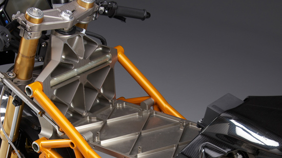 The Mission R chassis uses unique components to achieve the geometry and packaging demands of a high-performance motorcycle. The battery is a large box surrounded on four sides by three different structure types. At the front, a machined aluminum box serves as the steering head/fork mount and spans the full width of the battery. At the rear, the fully stressed “power unit” contains the motor, primary drive, and countershaft as well as the pivot for the swing arm.