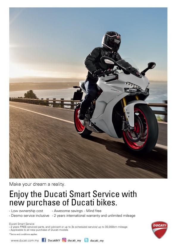 Bagi membantu mengurangkan kos pemilikan, Ducati Malaysia baru-baru ini telah melancarkan kempen Smart Service, yang menawarkan kepada pelanggan yang layak, pelincir percuma dan perkhidmatan servis percuma selama 2 tahun, atau hingga 30,000km termasuklah servis DESMO (yang mana tiba dahulu), dengan terma dan syarat. Penjimatan ini juga disertakan dengan waranti 2 tahun ( tanpa had pembatuan).