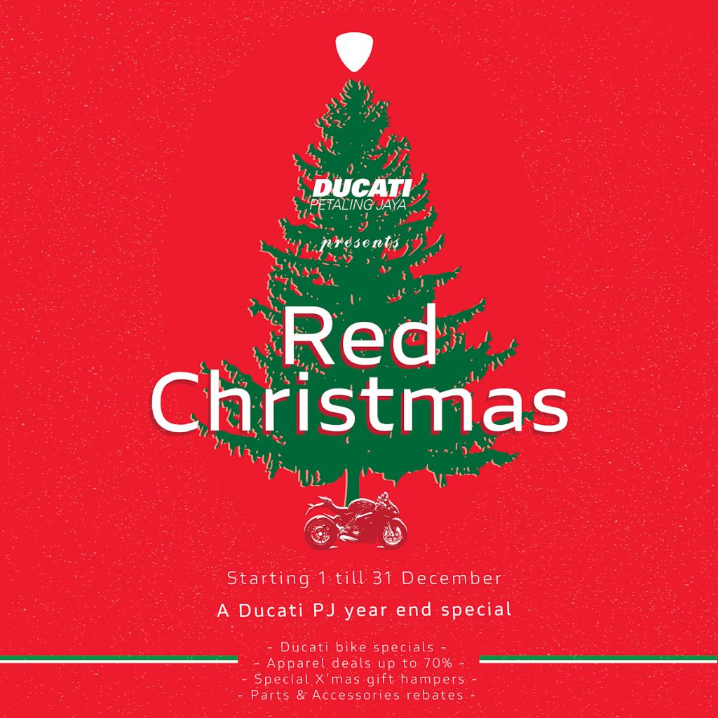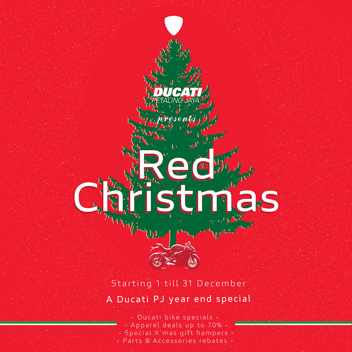 Sepanjang bulan Disember 2018 ini, Ducati Malaysia akan menawar tawaran dan rebat menarik sehingga 80% sempena promosi istimewa hujung tahun dan juga sambutan Hari Natal mereka iaitu Ducati Red Christmas!