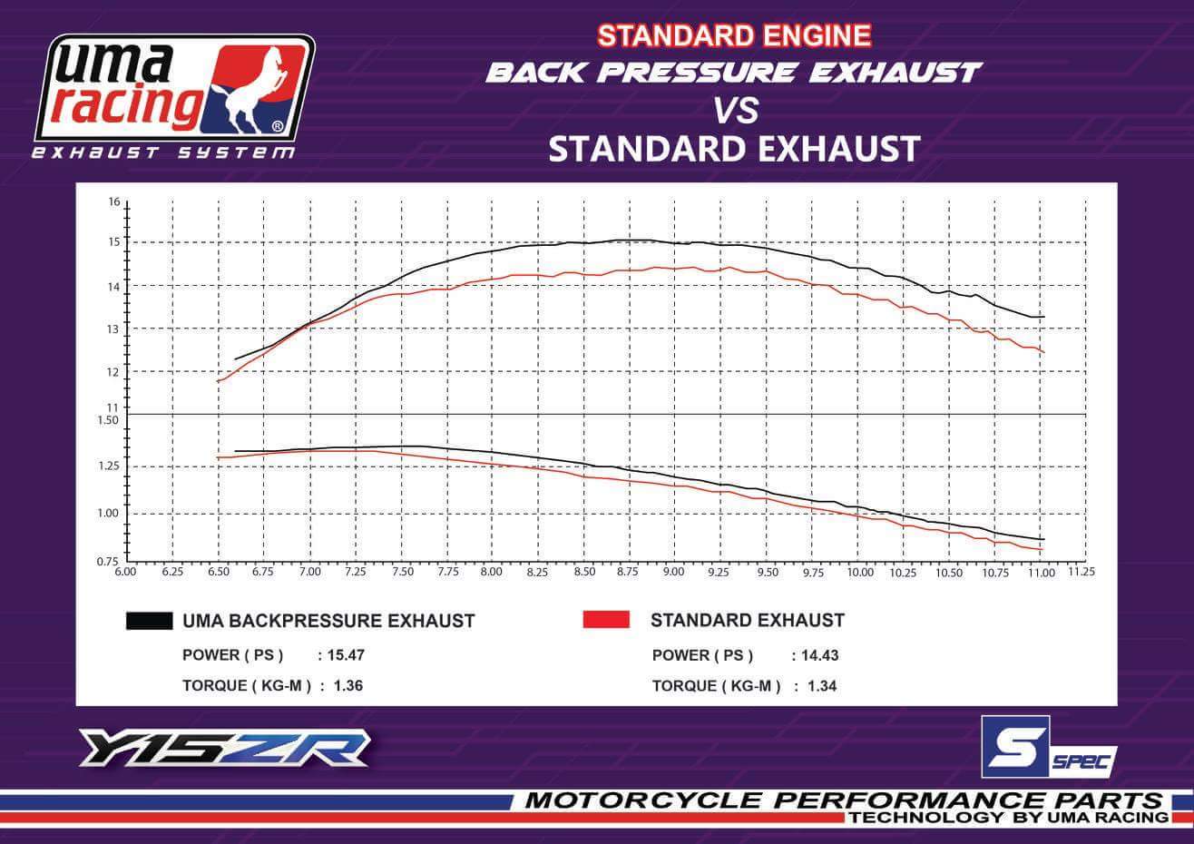 Ekzos ini memberikan peningkatan sebanyak 1.04PS menjadikan kuasa maksimum Y15ZR sejumlah 15.47PS berbanding ekzos asal pada 14.43PS (data dari Uma Racing).