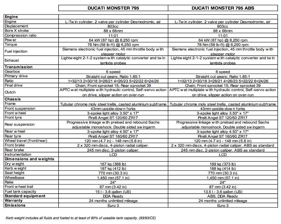 Technical Specs comparison of Ducati Monster 795 ABS and Non-ABS