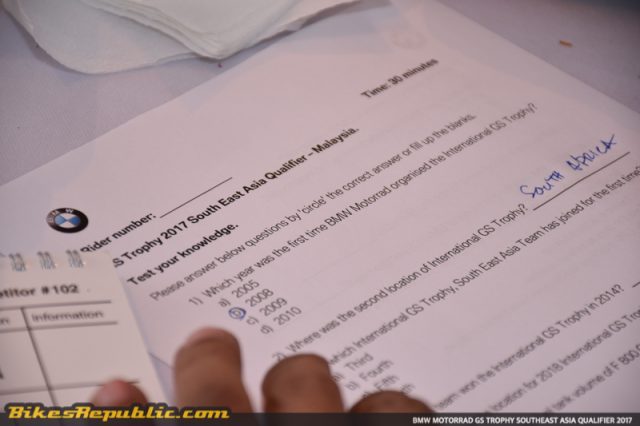 Malah terdapat juga “ujian pengetahuan” yang terdiri daripada soalan-soalan trivia, sejarah, dan spesifikasi teknikal motosikal BMW sejurus selepas makan tengah hari, sewaktu peserta masih lagi kekenyangan. Para peserta juga perlu menyerahkan telefon mereka sebelum bermulanya ujian, jadi Google tidak dapat membantu mereka.