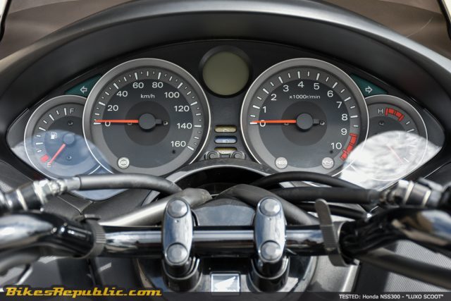 Gugusan instrumennya yang besar itu tampak seperti pernah saya lihat sebelum ini, barangkali pada sebuah kereta Honda mahu pun sebuah Gold Wing? Ianya didominasi oleh speedometer analog dan ‘rev counter’ yang besar, diapit oleh tolok bahanapi dan tolok suhu pendingin. Terdapat paparan LCD bulat yang lebih kecil di bahagian atas yang memaparkan purata penggunaan bahanapi bagi setiap liter/100 km.