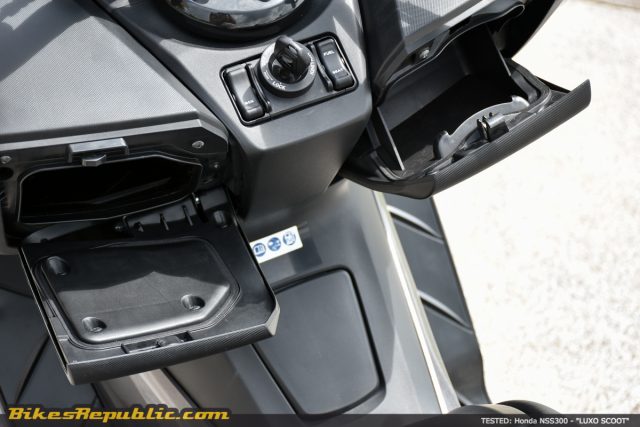 Terdapat dua lagi “glove box” yang diterapkan pada reraup hadapannya yang besar. Kompartmen kanan tidak berkunci dan lebih kecil, cukup bagi menempatkan dompet serta sekotak rook. Kompartmen kirinya pula, perlu dibuka dengan menekan satu butang. Ianya begitu dalam saya dapat memasukkan tangan sehingga ke siku! Jikalau ini adalah sebuah filem seram, pasti ada makhluk yang sedang menarik tangan saya dari dalam… Di kompartmen itu saya menyimpan sebotol 100 Plus, dengan telefon serta sepasang sarung tangan. Terdapat juga palam 12V jenis pemetik api bagi anda mengecas telefon atau sebarang peranti yang lain.