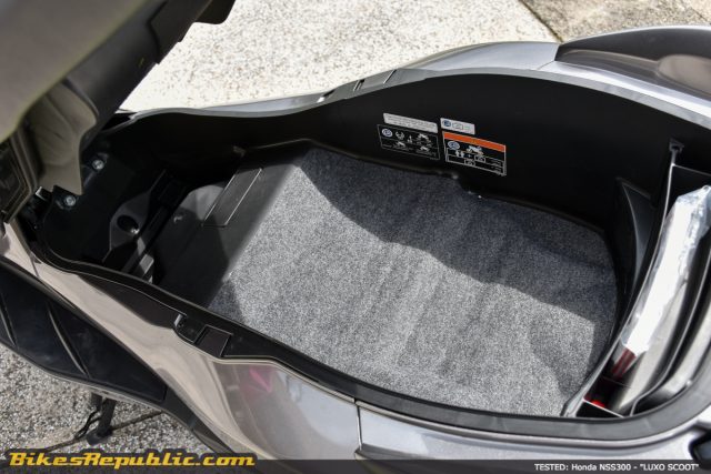 Di mana PCX merupakan sebuah jentera ke sana-sini yang kompak, NSS ini mengisi peranan sebagai jentera berulang-alik harian hinggalah kepada sebuah jentera kembara automatik jarak jauh. Oleh dengan itu, NSS ini menawarkan ruangan simpanan yang amat besar. Di bawah pelana sahaja, terletak ruangan sebesar 62 liter yang dalam dan luas.