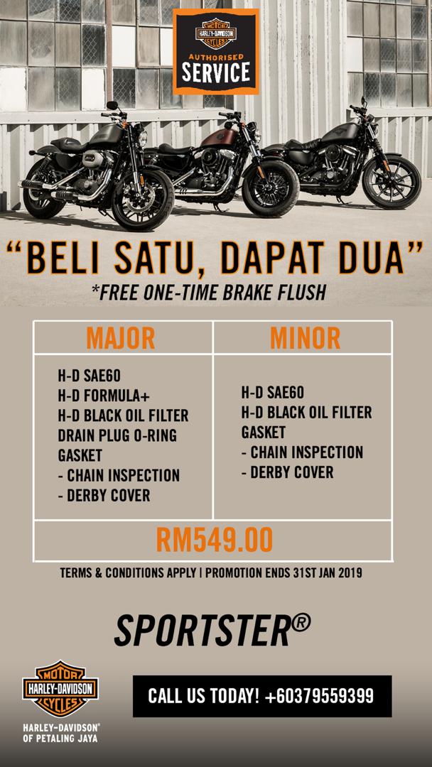 Bagi pemilik motosikal Harley-Davidson pula, terdapat satu diskaun istimewa 20% untuk alat ganti dan aksesori motosikal. Dan sekiranya anda ahli kelab Harley-Davidson Owners Group, anda berpeluang menikmati tambahan diskaun 5% untuk jumlah keseluruhan diskaun sebanyak 25% bagi menyerikan lagi motosikal anda. Perlu diingatkan bahawa promosi ini tidak sah bagi perkhidmatan penyelenggaraan dan membaiki motosikal.