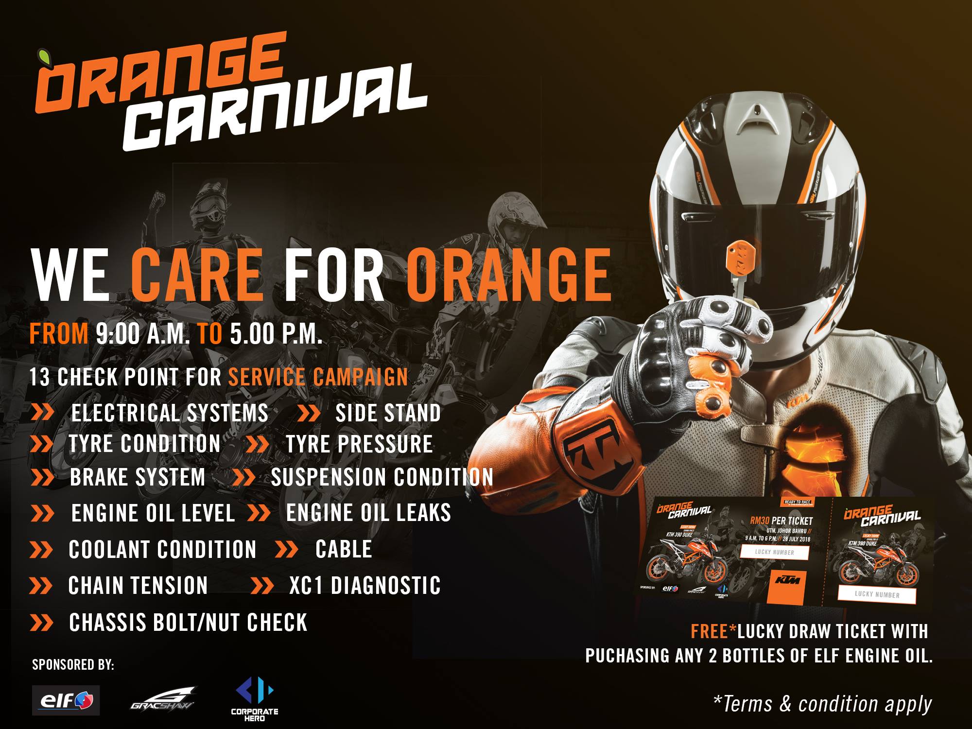 KTM Malaysia juga menawarkan sebuah kempen penyelenggaraan istimewa khas buat pemilik KTM yang mana meliputi pemeriksaan keselamatan 13 bahagian PERCUMA dari jam 9 pagi hingga 5 petang. Para pemilik yang membeli 2 botol minyak pelincir ELF juga akan menerima satu tiket cabutan bertuah. Bahagian-bahagian yang akan diperiksa adalah:
