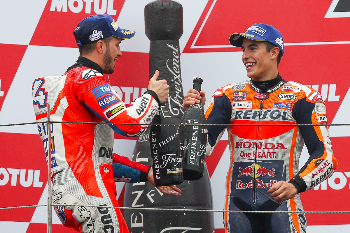 Dovizioso juga mempunyai rekod kemenangan yang sama dengan Marquez untuk tahun 2017 ini tetapi hanya dua penamat podium yang lain yang telah dicapainya. Berbanding dengan Marquez, hanya satu DNF sahaja buat Dovizioso pada musim ini namun keputusan perlumbaannya agak tidak konsisten dengan penamat perlumbaan yang paling rendah di tempat ke-13 di Australia.