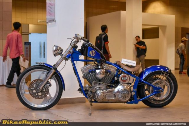 Sepasang paip ekzos ‘Tommy Gun’ ditarik hingga ke belakang, dan motosikal itu dicat dengan warna cat navy blue yang cukup cantik sekali.