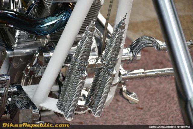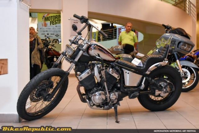 Empat buah motosikal buatan khas dengan fork ‘outrigger’ telah menarik perhatian orang ramai. Ianya kelihatan seperti yang telah dibina oleh Eastern Bobber.