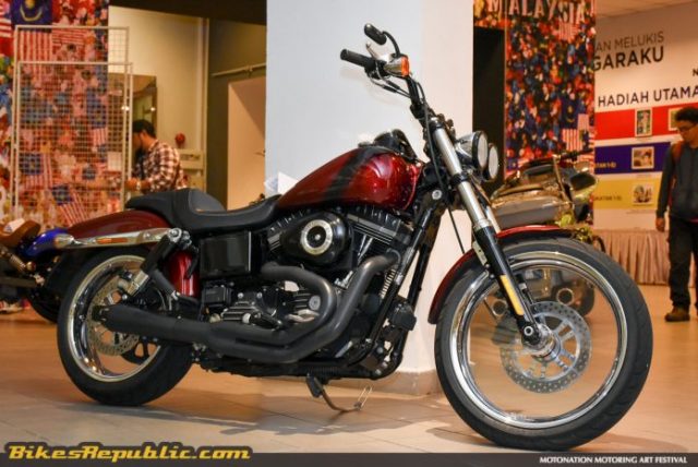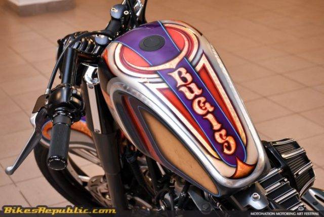 Sebuah Harley Fat Bob yang tampak agak standard kecuali pada hab roda lutsinar plexiglass yang membuatkan rodanya tampak seakan-akan terapung di atas udara.
