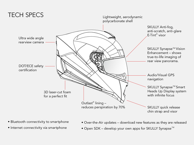 Pada tahun 2014 yang lalu ketika projek ini baru dimulakan, SKULLY menjanjikan masa depan permotosikalan dengan teknologi yang tercanggih yang akan diterapkan terus ke helmet itu sendiri, terutamanya bagi helmet AR-1 yang akan dilengkapkan dengan paparan pandang hadapan (HUD). Walau bagaimanapun, mereka terpaksa menghentikan usaha mereka pada tahun lalu atas beberapa faktor yang berbeza.