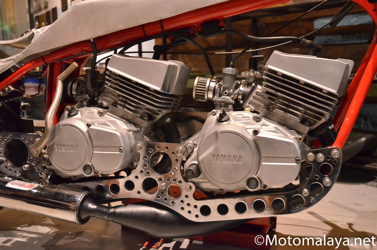 Gabungan dua enjin Yamaha RXZ 135cc dua lejang yang dapat berfungsi seiringan disebabkan oleh pencapaian kejuruteraan yang dijayakan dengan menyambung pacuan utamanya menggunakan aturcara pacuan rantai terakhir yang menghubungkan kedua-dua blok enjin itu bersama. Dari segi kapasiti, motosikal ini secara bersama mempunyai 270cc yang mana ianya hampir sama dengan sebuah motosikal lumba empat lejang middleweight.