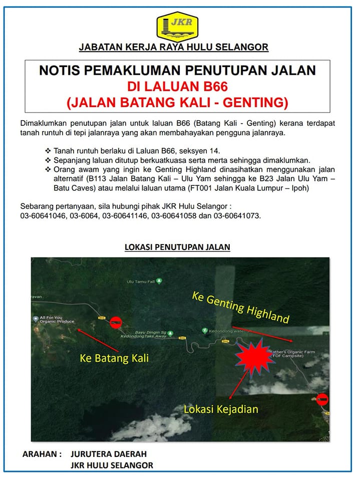Berdasarkan perkongsian di Facebook, notis penutupan jalan tersebut adalah di Laluan B66 (Jalan Batang Kali-Genting).