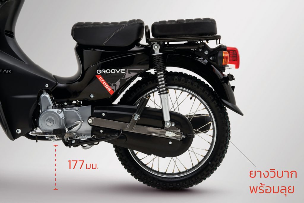 Hasilnya, Groove Cross 125 ini tampil dengan mudguard tinggi yang dipadankan bersama fork depan teleskopik dan penyerap hentakan berkembar belakang. Bagi memastikan Groove Cross 125 ini sesuai ditunggang dalam pelbagai jenis keadaan, motosikal tersebut tampil dengan jarak kelegaan tanah 177mm.