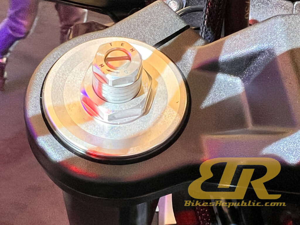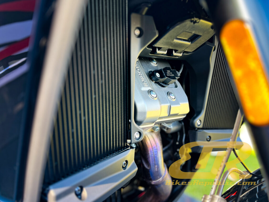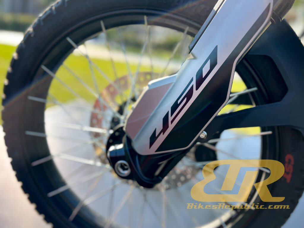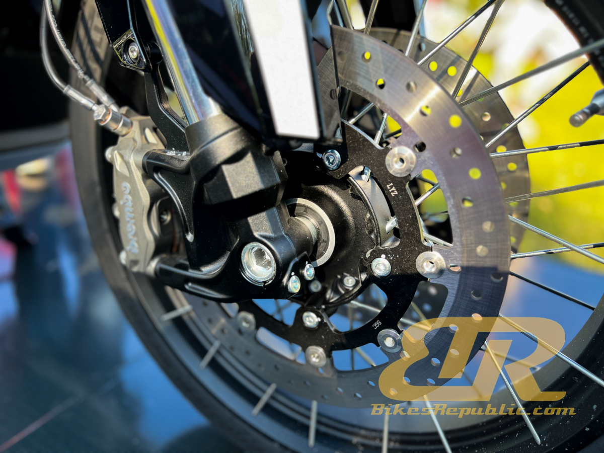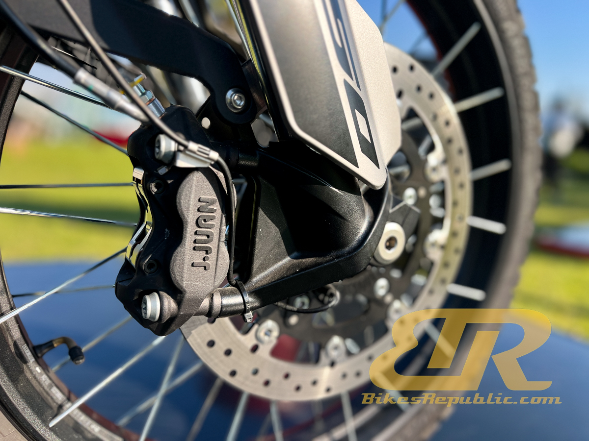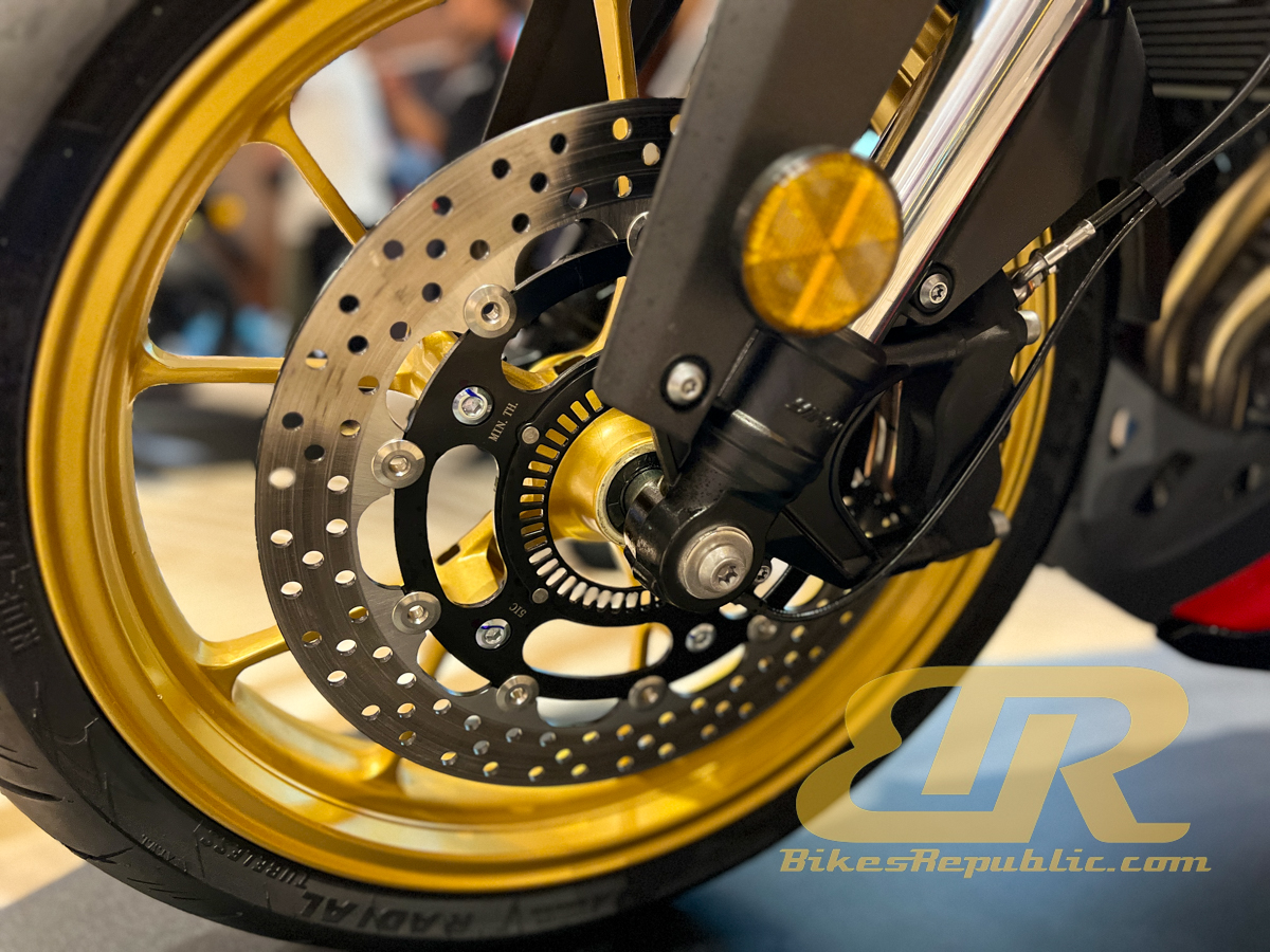 - Suspension duties are carried out by telescopic forks (front) and a monoshock (rear) which supports a single-sided swingarm.