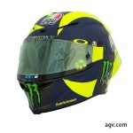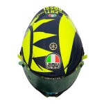 With fewer colours than usual, Rossi’s iconic Sun and Moon (Soleluna) logo is the main star of the helmet’s design highlighted in a matte yellow and black colour combination. In honour of fallen racing brother, Marco Simoncelli, a small number 58 can be seen on the left rear portion of the lid.