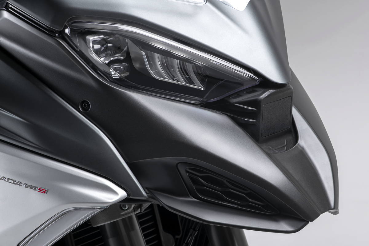 Looking at the front, the headlight is inspired by the very sporty Panigale series thanks to its full-LED setup and daytime-running lights with cornering illumination functions. You’ll also see a strange square box embedded upfront which is the bike’s internal radar system linked to its Adaptive Cruise Control and Blind Spot Detection systems.
