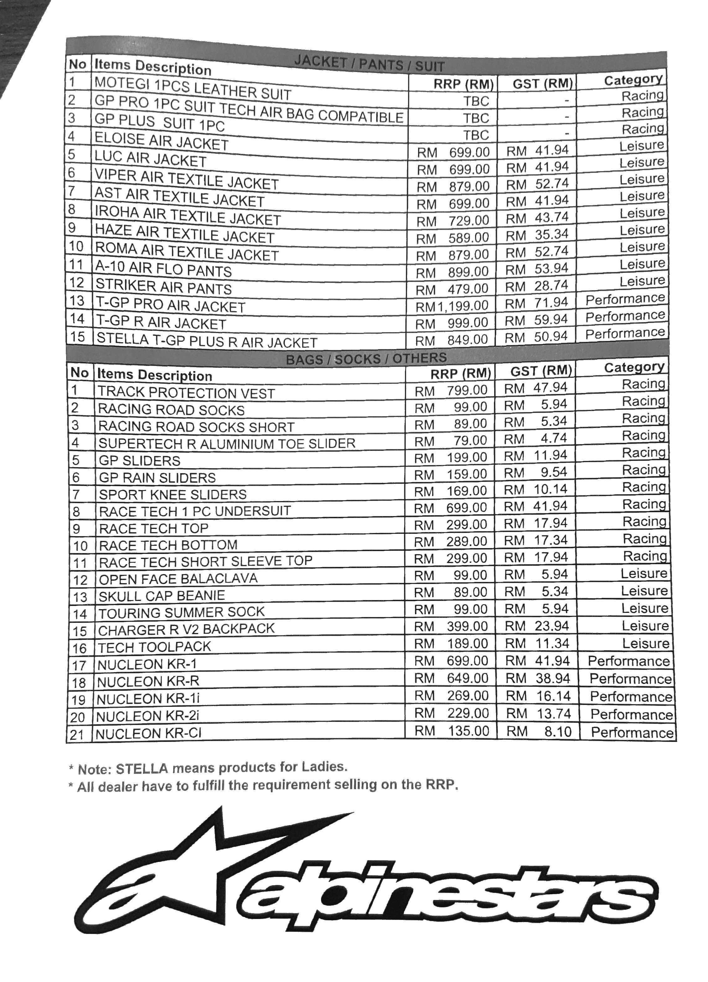 You can refer to the scanned pricelist of the Alpinestars gear currently available under Sinar Puncak’s distributorship below.