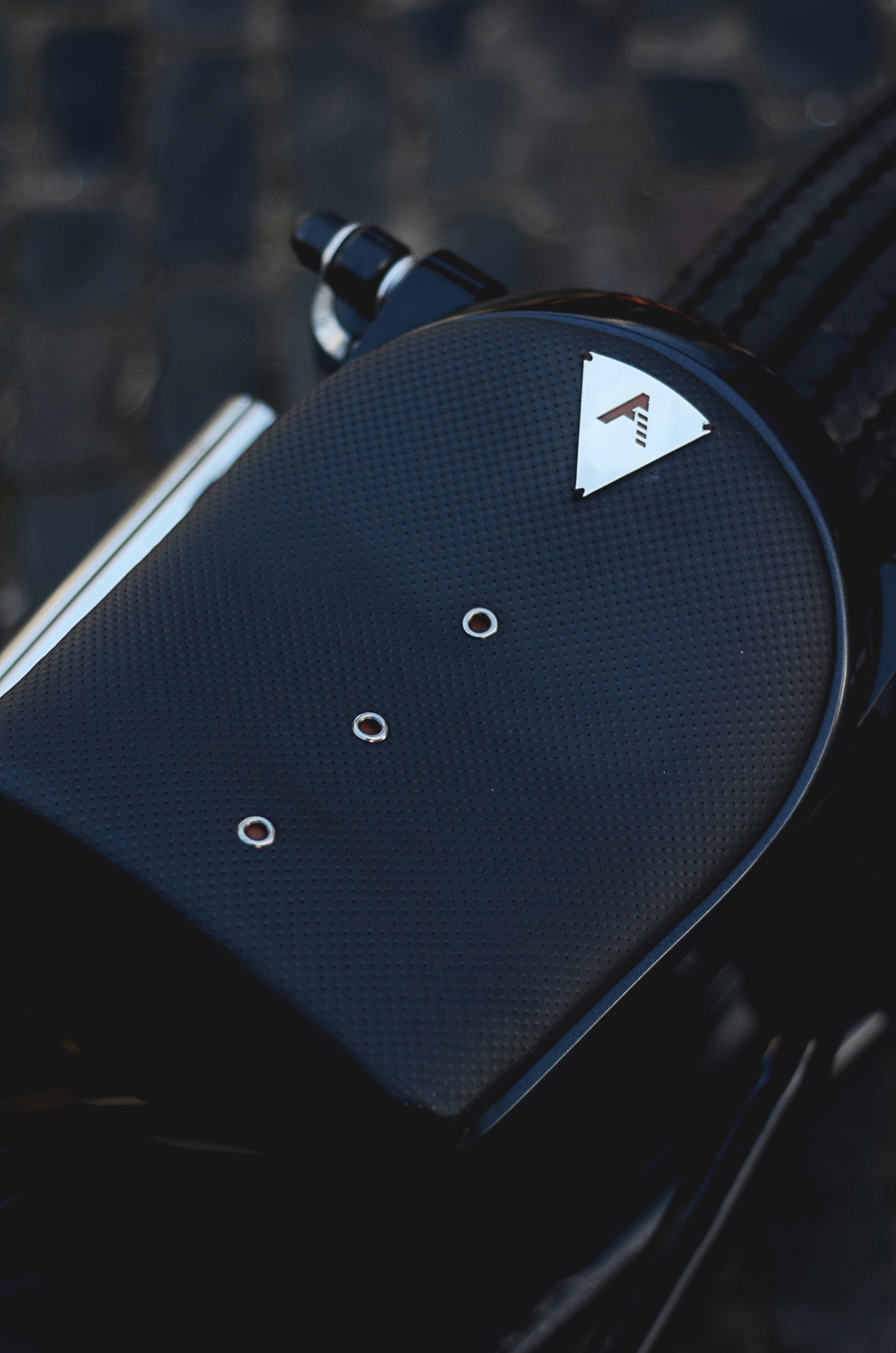 The long and slender fuel tank was hand beaten out of aluminium and comes with a traditional pop-and-twist tank cap. The seat design is also a masterpiece with its dark, perforated leather cover being decorated with Auto Fabrica’s logo plaque plus three small ‘eyelets’ that reveal contrasting yet discreet set of tan leather inserts.