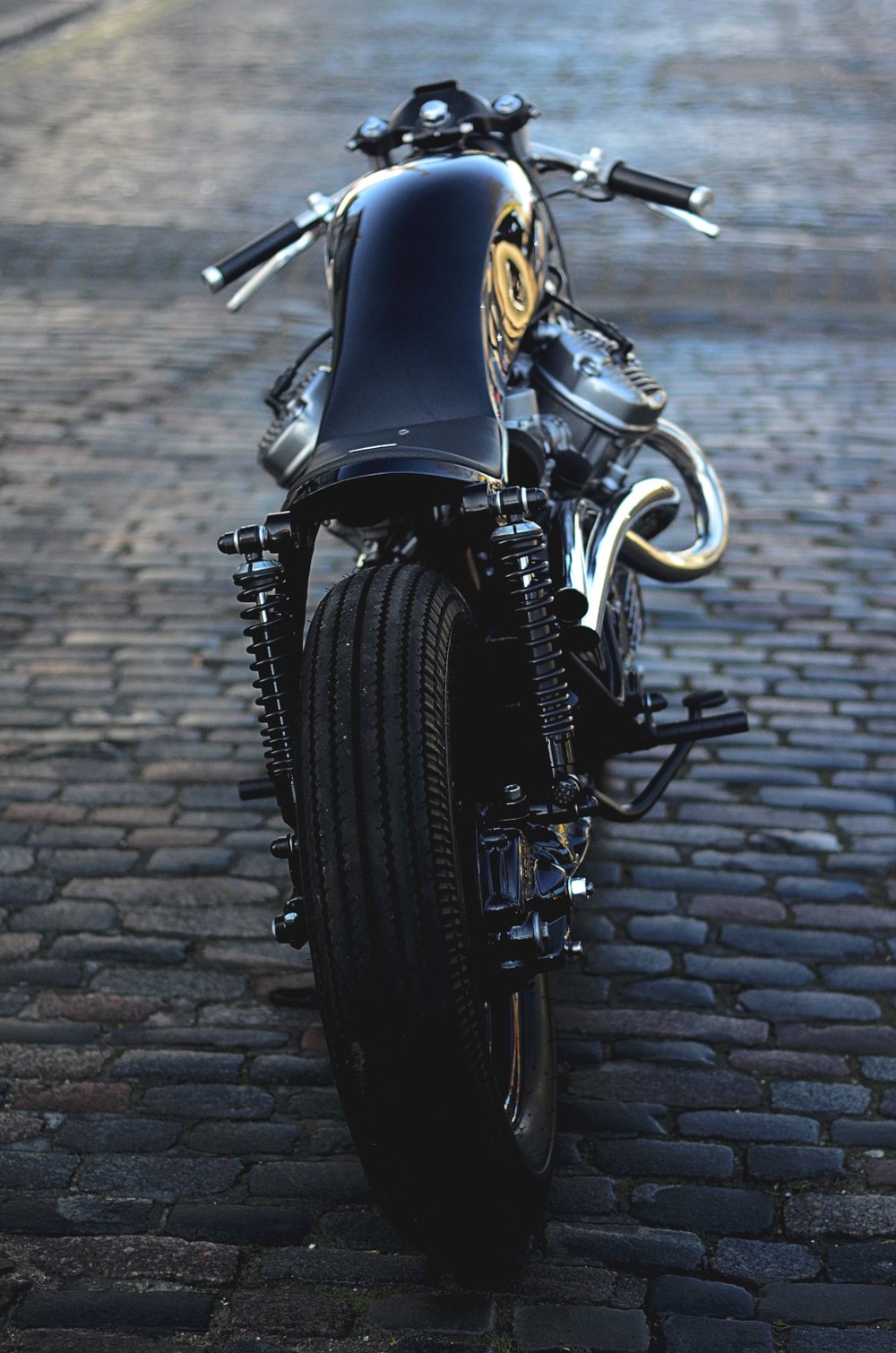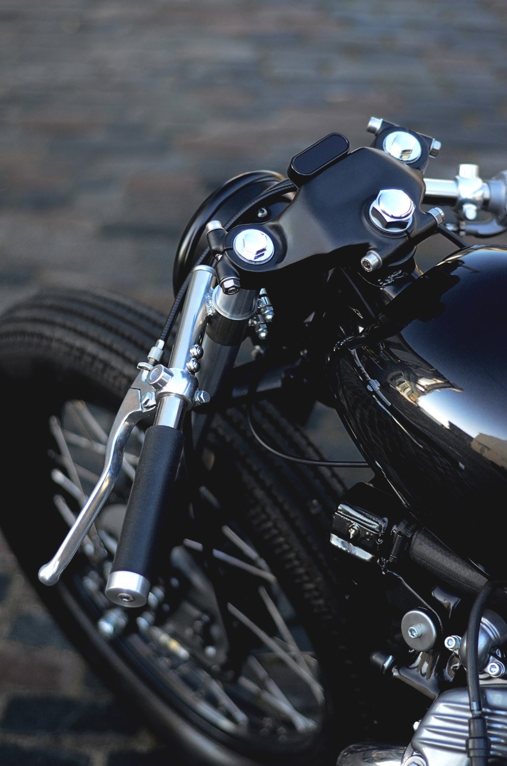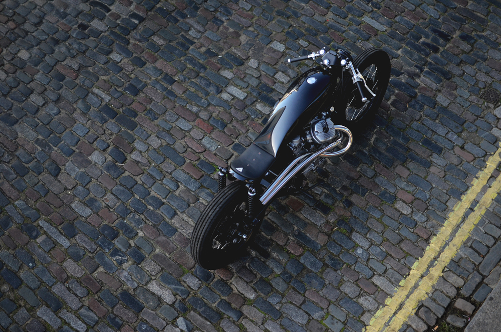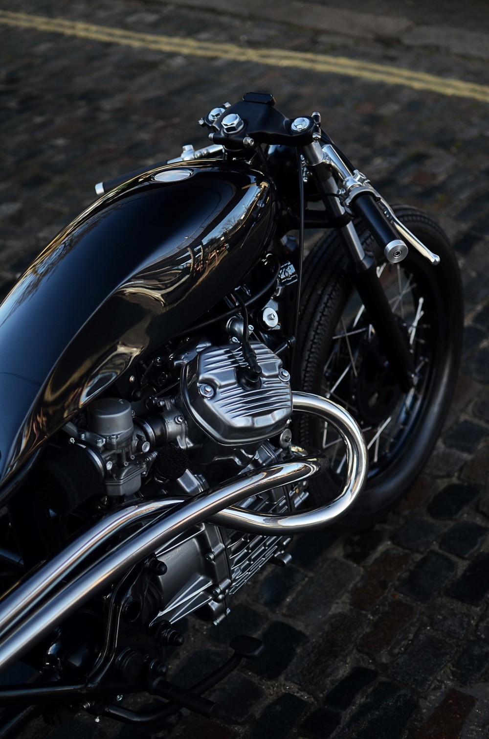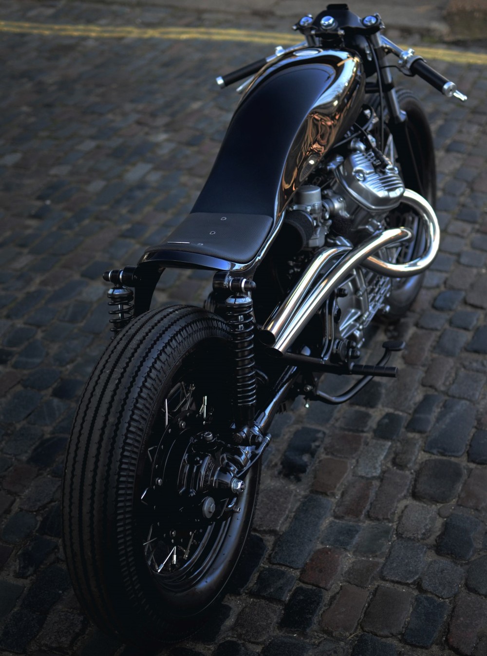 Up front, the Auto Fabrica Type 8 gets its forks shortened and now uses a pair of Maxton springs whilst the rear is gets a pair of Hagon twin shocks. The stock bike’s rather ugly Comstar wheels have also been swapped for new spoked design units. The front unit is lifted from the Honda CB450 TLS model and measures 19-inches whilst the rear’s a 16-inch unit laced into a Honda hub.