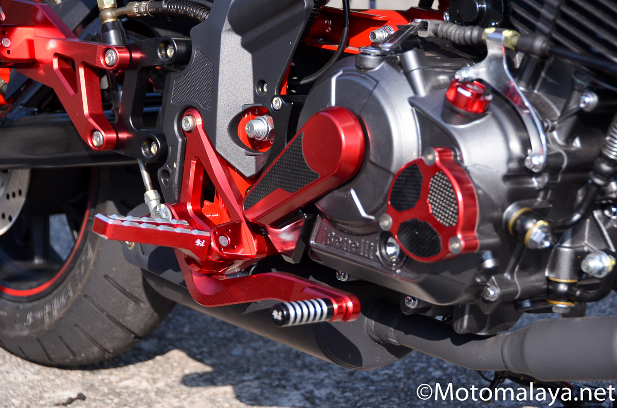 Back to the limited edition TNT 135. Garnished with 15 new aesthetic updates and accessories, only 1,000 of these babies will go on sale for the Malaysian market. These accessories include new side mirrors, front brake reservoir, engine oil cap, axle bars, oil filter cap, engine protector, footrests, frame decoration piece, graphics, limited edition sticker, handlebar riser, levers, and our favourite, the carbon fibre exhaust cover.