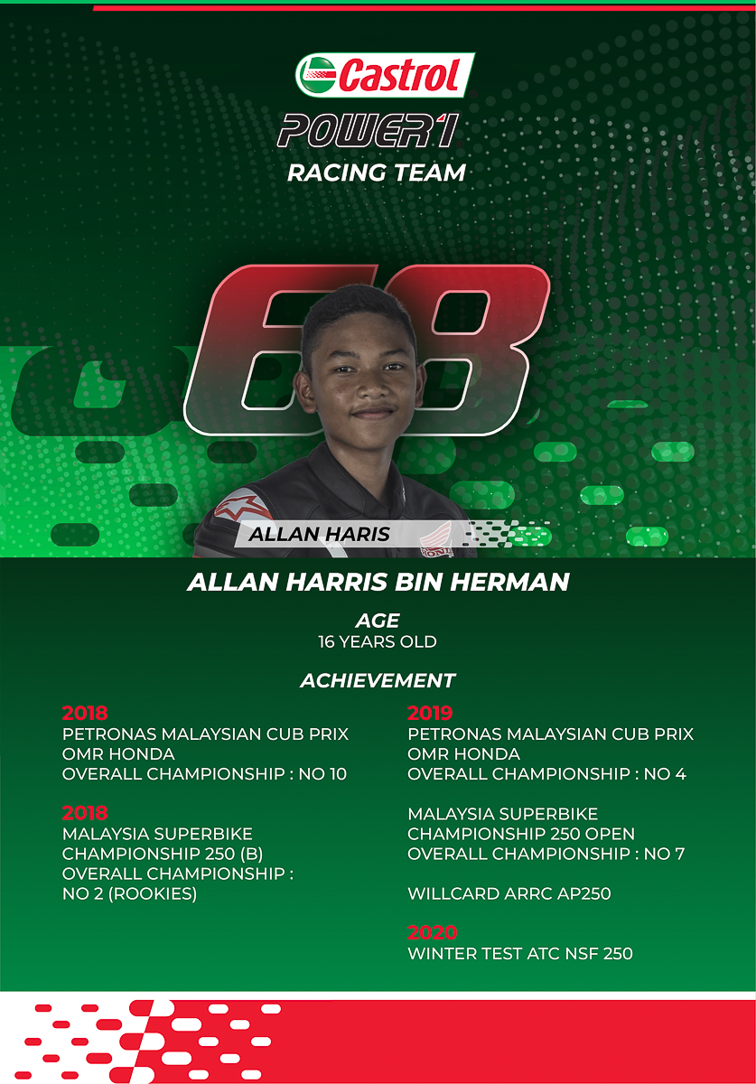 The Castrol POWER1 Racing team and their riders, Muhammad Harith Haziq bin Zamri and Allan Harris bin Herman, will be flying the brand’s flags in the age restricted WIRA category. Both these 16-year-olds are eager to produce some results after months of non-racing due to COVID-19 and MCO.