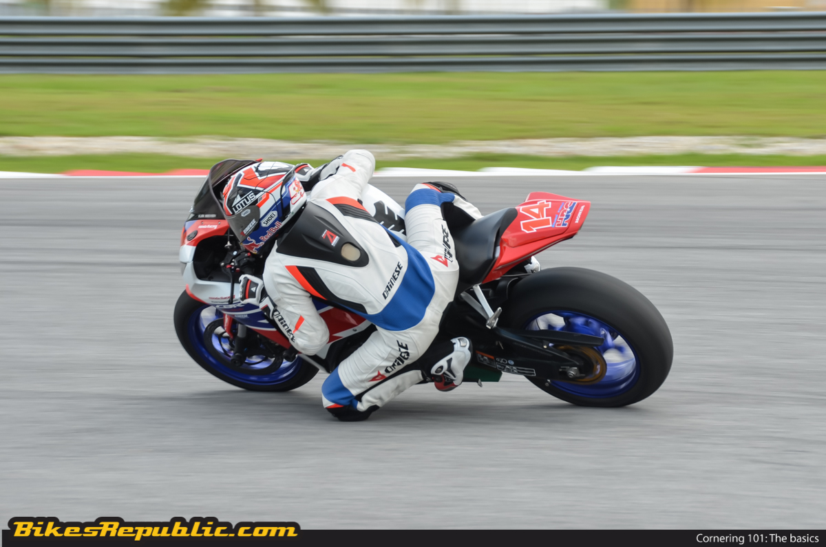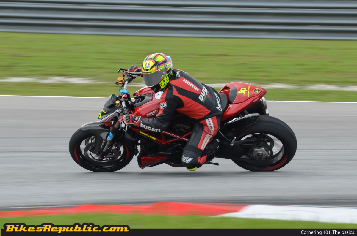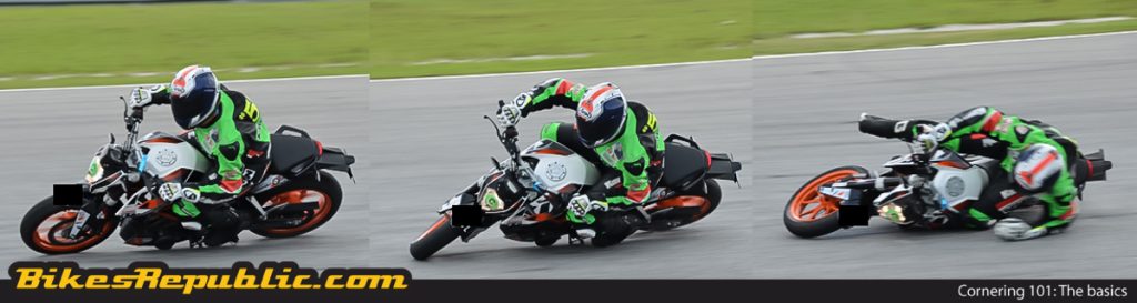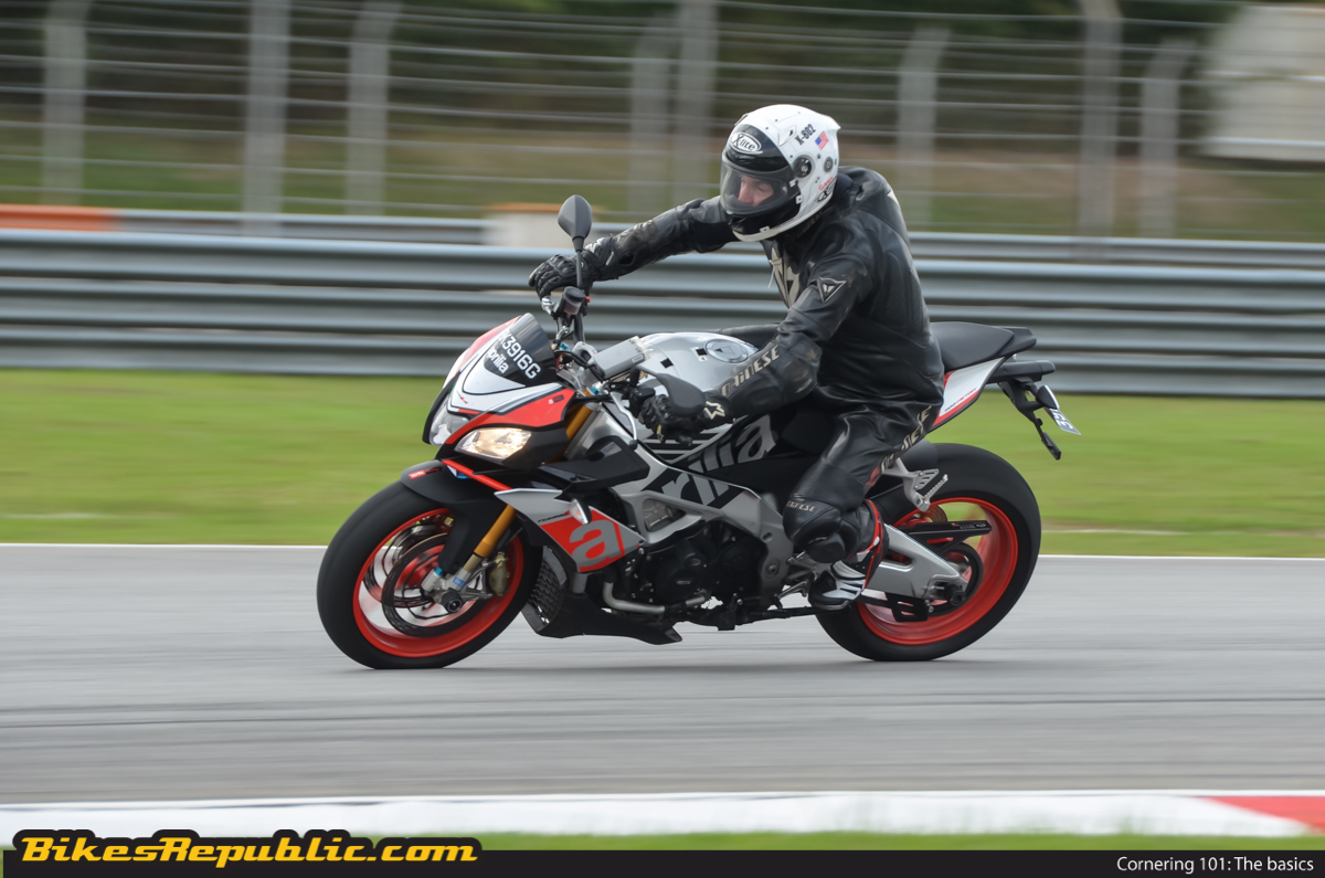 Getting the bike to turn quickly is essential. You can do this by pushing the right bar forward to turn right and the left bar forward to turn left – counter-steering. Then, once you have the correct angle of lean, it’s time to relax, with your arms at least. The best thing is to relax as you get more feel of what the bike is doing.