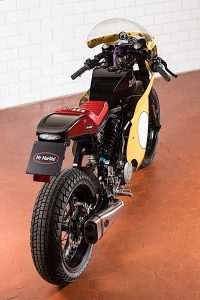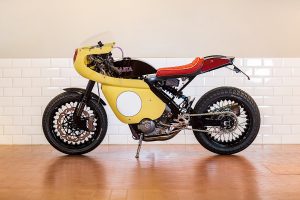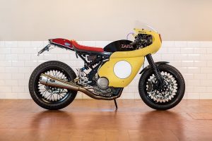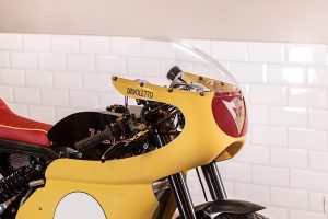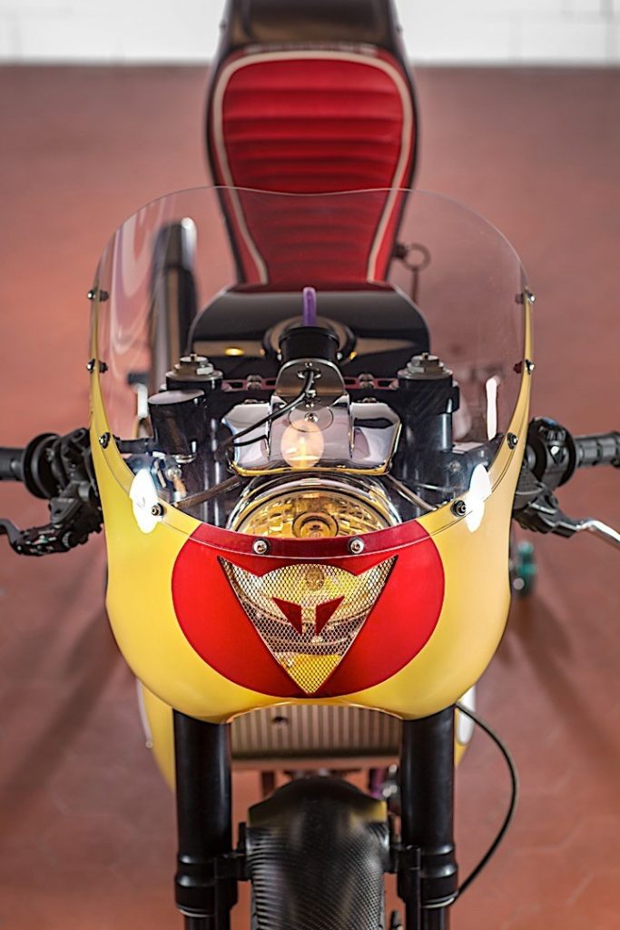 Highlights include a classic racer-like fairing, bubble-windshield, wire wheels, low clip-on bars and a custom exhaust system. Notably, the custom seat was made using the same leather material with the same treatment applied in the Dainese Speciale jacket as well.