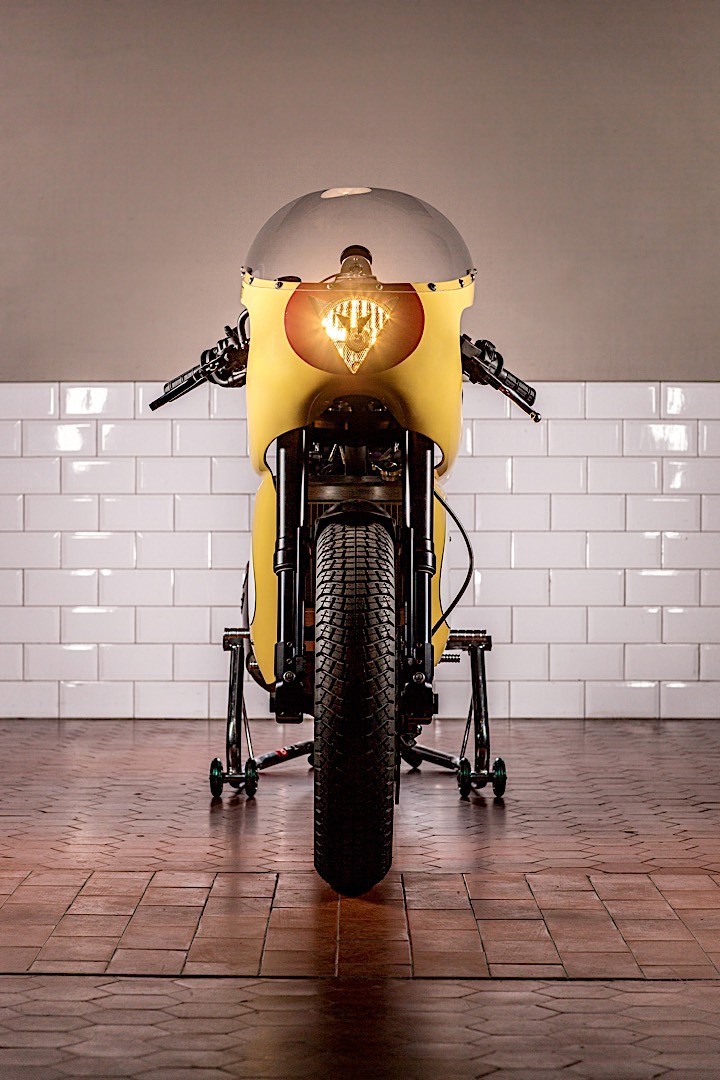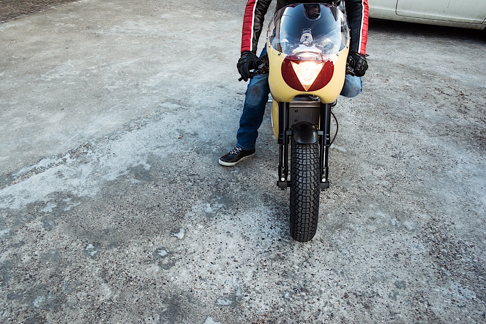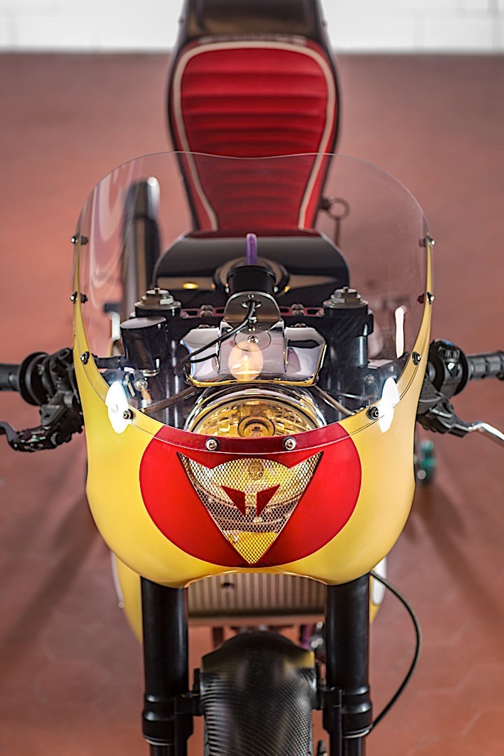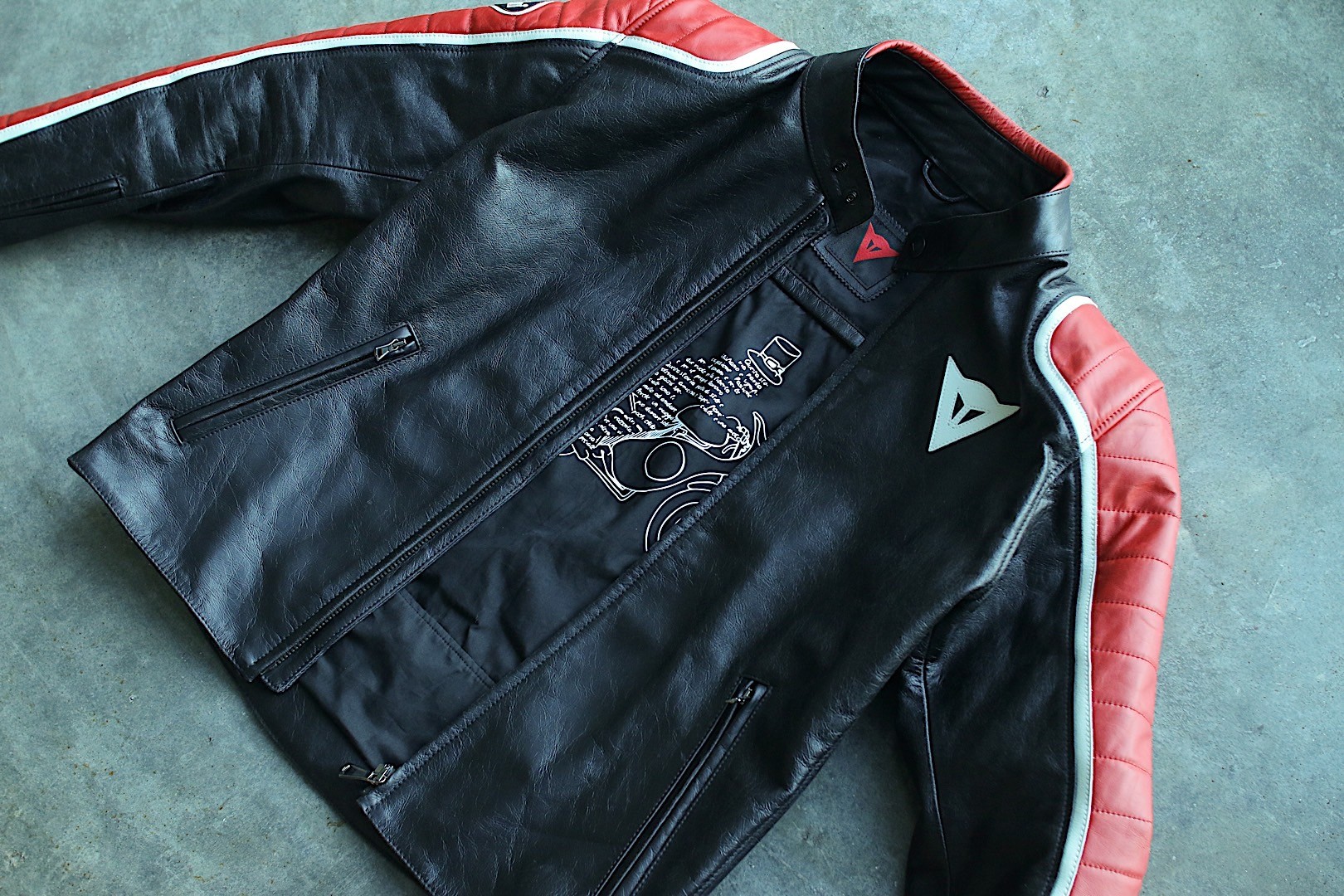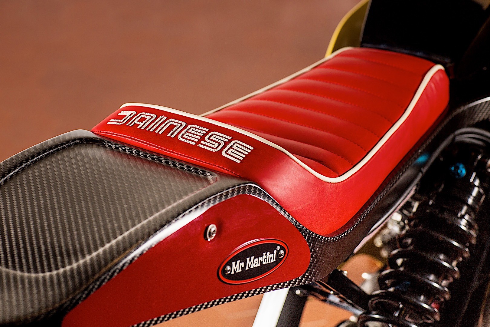 Highlights include a classic racer-like fairing, bubble-windshield, wire wheels, low clip-on bars and a custom exhaust system. Notably, the custom seat was made using the same leather material with the same treatment applied in the Dainese Speciale jacket as well.
