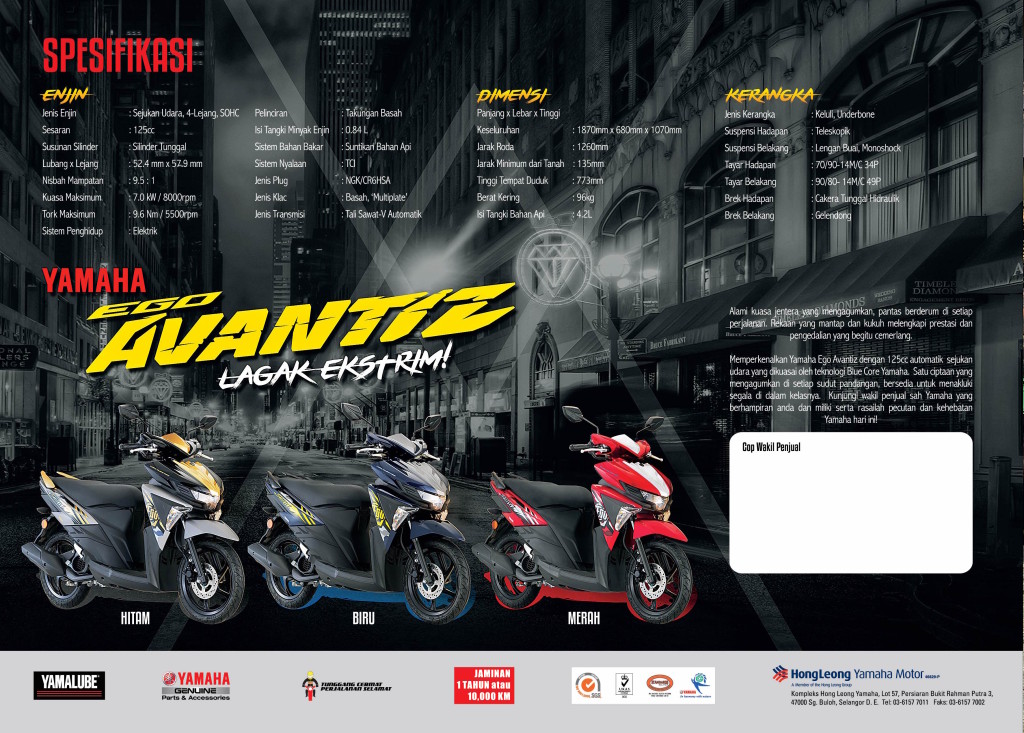 Malaysian Yamaha motorcycles assembler and distributors Hong Leong Yamaha Motor Sdn Bhd (HLYM) updated its model line up after introducing the new Yamaha Ego Avantiz scooter model earlier today in Kuala Lumpur.