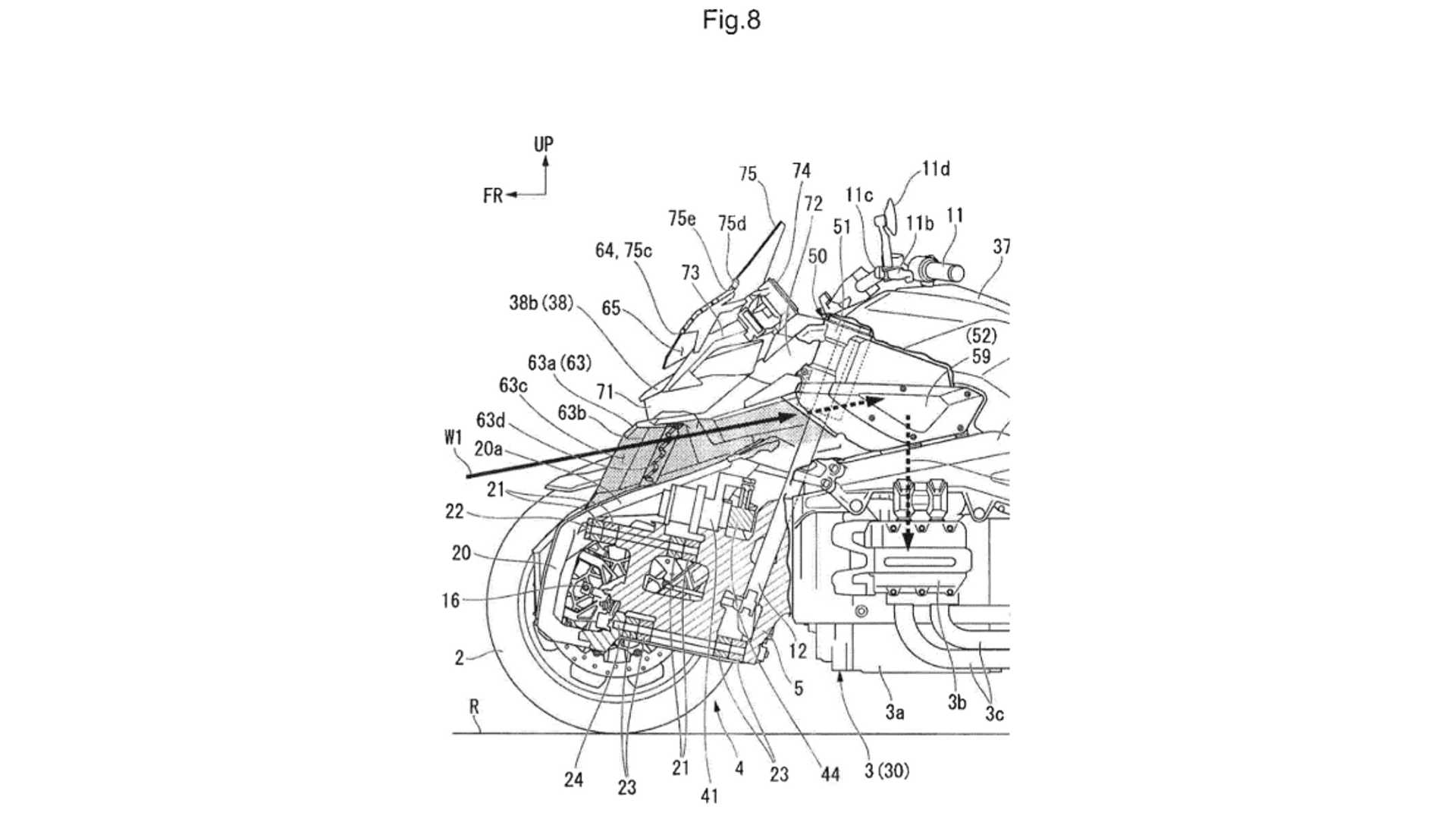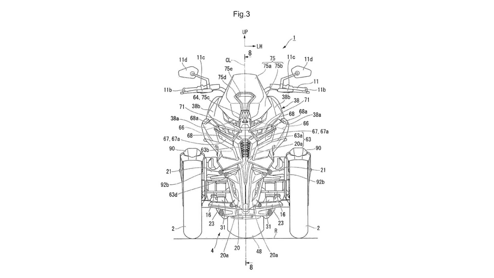 The magazine RideApart dug up these patents to a Honda leaning trike. From the drawings, it is powered by a flat-Four engine. But the patent descriptions remarked, “The cylinder may be a two-cylinder type or a six-cylinder type.” But we are confident that it should be powered by the the GL1800 Gold Wing’s flat-Six, in view of Yamaha’s development of a 1700cc three-wheeler.