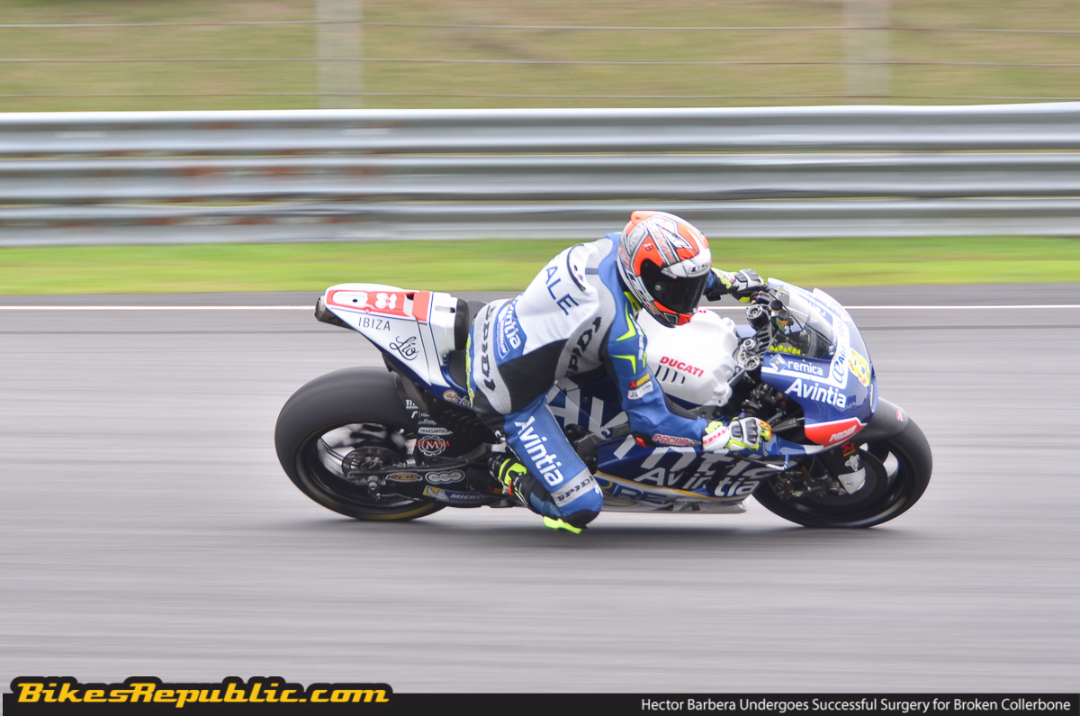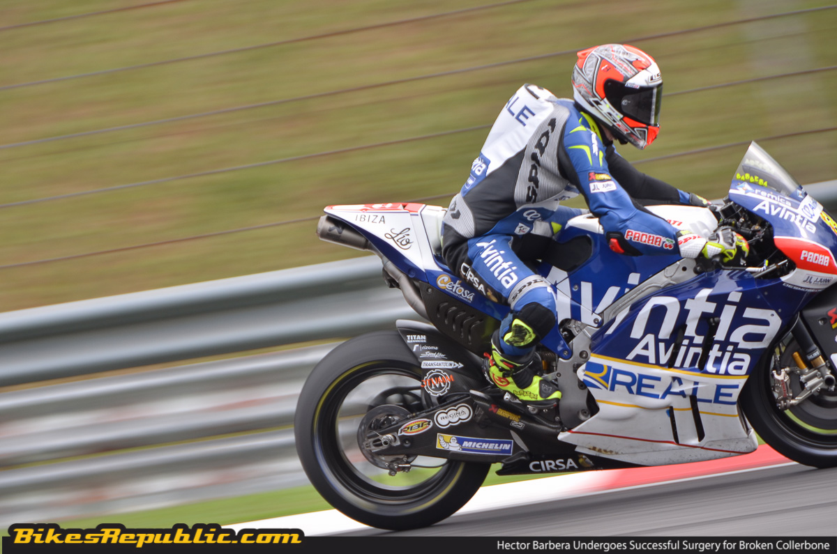 According to the Reale Avintia Racing (aka Reale Esponsorama Racing) MotoGP outfit, Hector Barbera has successful went through an operation to fix his broken collarbone which he had obtained during a training session just a couple of days back. The Avintia Racing rider suffered the injury following a crash at the Circuit Ricardo Tormo located in Valencia.