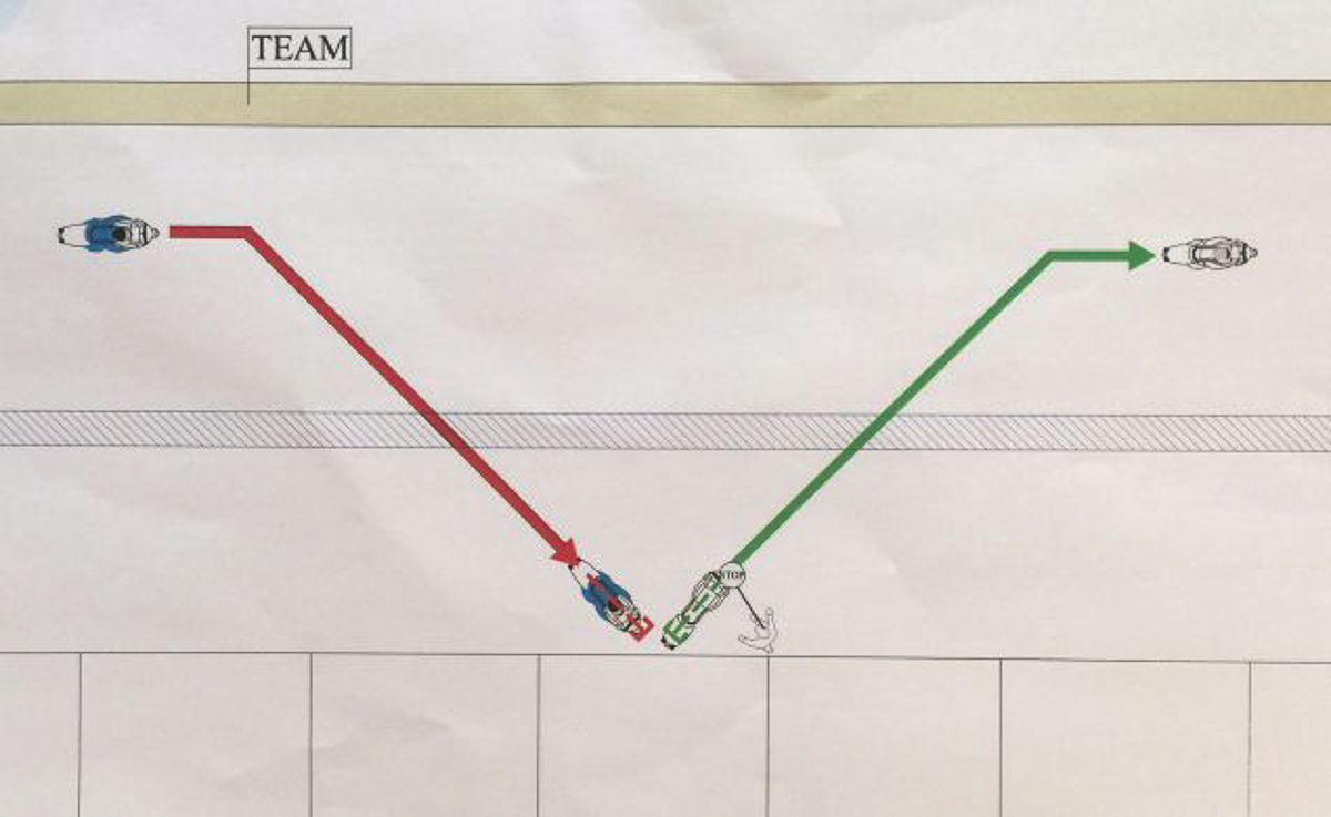 An additional mechanic will be in the pit lane with a Formula 1-style lollipop stick who will stand in front of the second bike to signal the rider when it is safe to re-enter the pit lane.