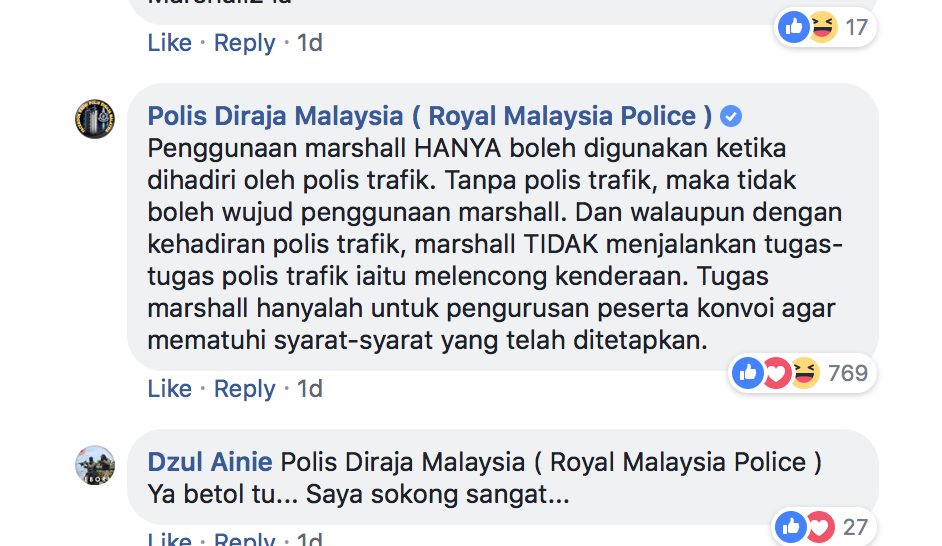 The post in PDRM’s official Facebook page also stated that the use of marshals in competitions, convoys or programs on public roads must be accompanied by the Traffic Police.