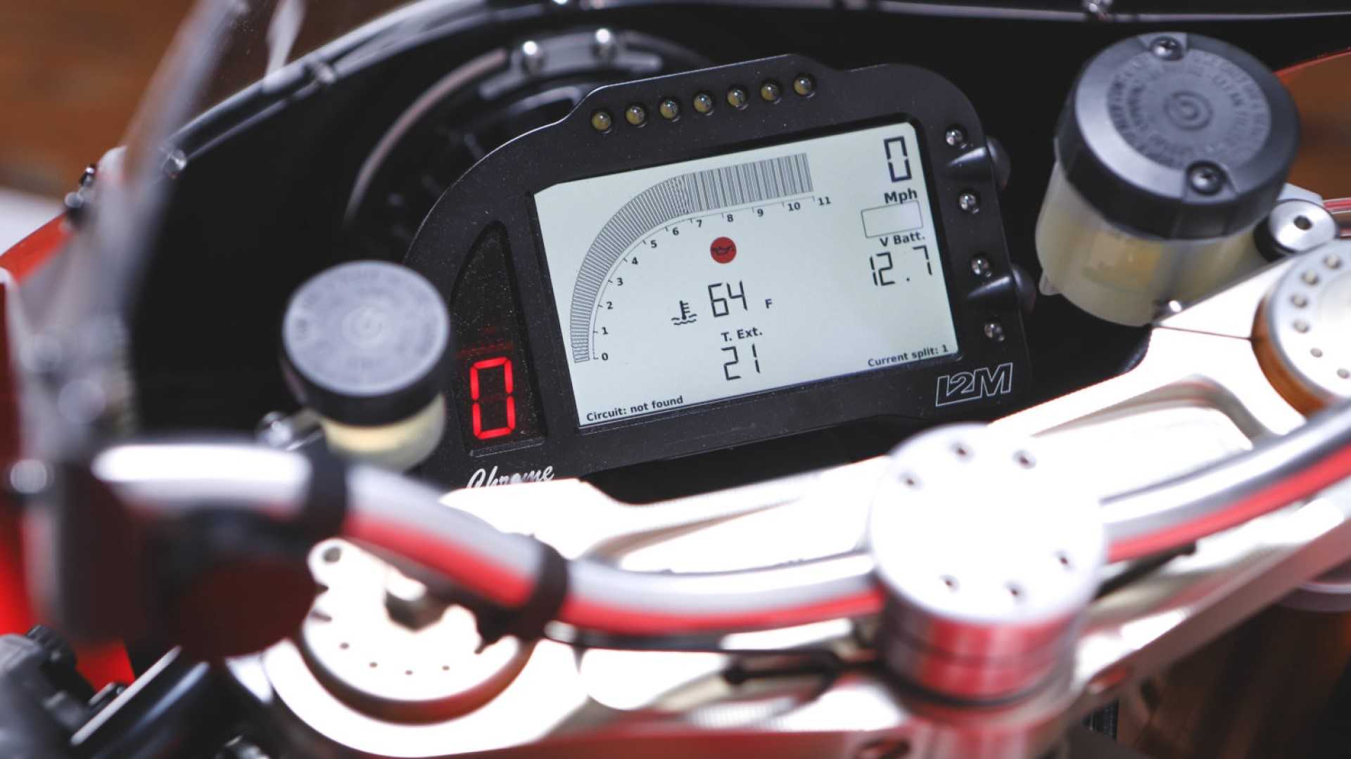 This particular example was built around the 4-valve, liquid-cooled 1098 engine (dry clutch, woohoo!), built by Bruce Meyers Performance. However, it features a custom WSM ECU. This ECU in turn features traction control, clutchless upshifts, full interface dashboard with data acquisition.
