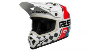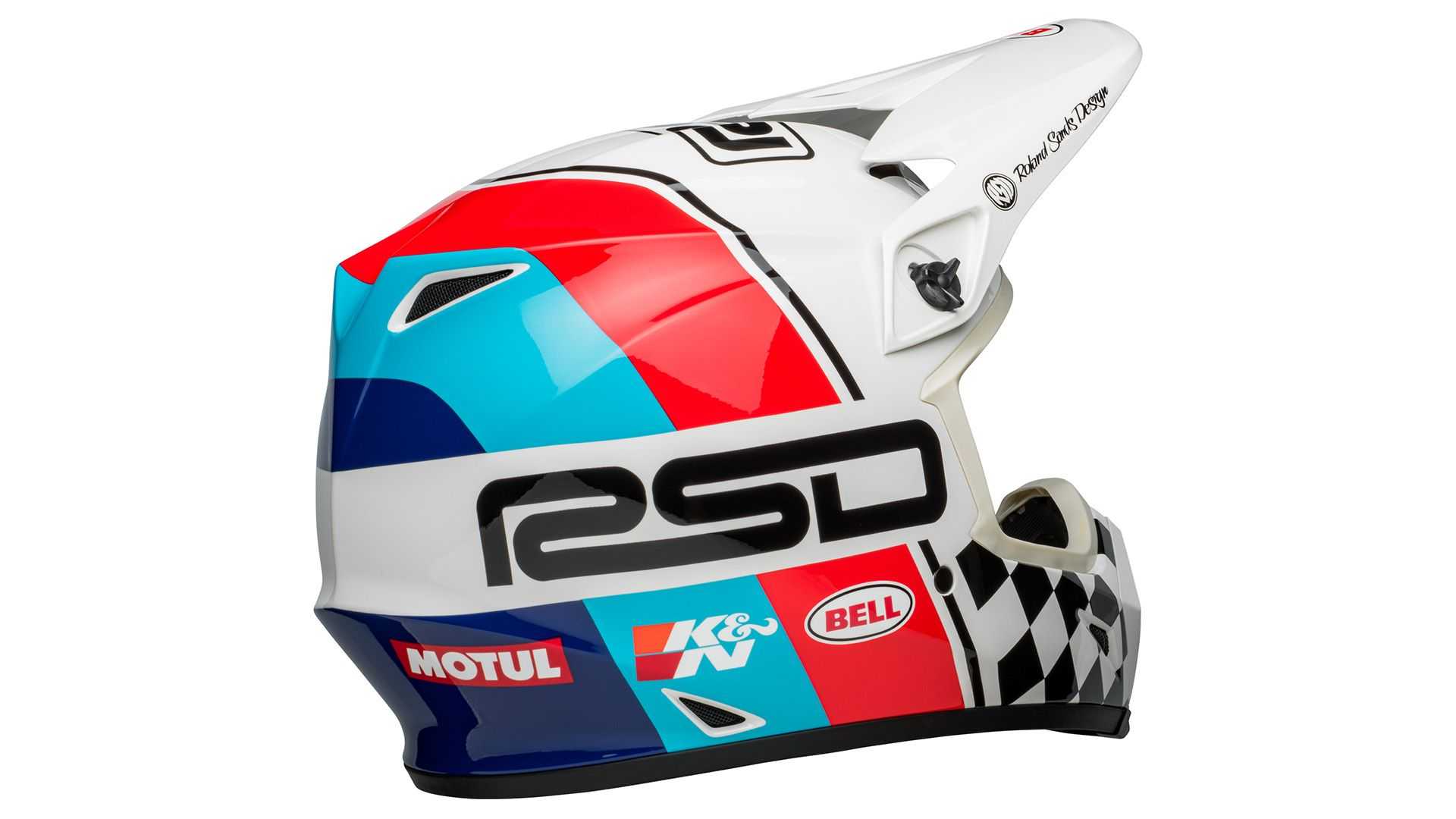 According to both Bell and RSD, the bright tri-colour scheme is a homage to racing liveries of the past – BMW’s glory days at the Dakar comes to mind. Aligning with that, Bell also paired the color block design with a checkered flag graphics on the chin bar, retro RSD logos on the sides and crown, as well as a set of Dunlop, K&N and Motul brand logos – longtime supporters of RSD.