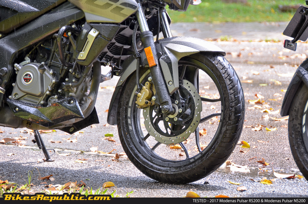 Both the RS200 and NS200 have the same suspension package with front telescopic forks and anti friction bush at the front ends and Nitrox monoshock absorber with canister handling the rear. We were pleasantly surprised on how well they do their job even at higher speeds. Both bikes offer stable riding experience but the NS200 is a bit more wobbly considering its slightly higher riding position and lack of wind protection unlike the RS200 and its adequately aggressive front fairing.