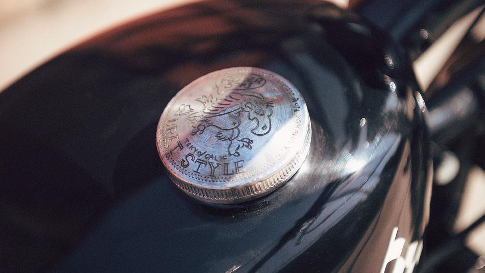 For starters, Takamine opted to clean up the front end before adding wider handlebars and a smaller headlight. The fuel tank is new and features a Brat Style engraved fuel cap. The same treatment was replicated in the custom air filter covers as well.